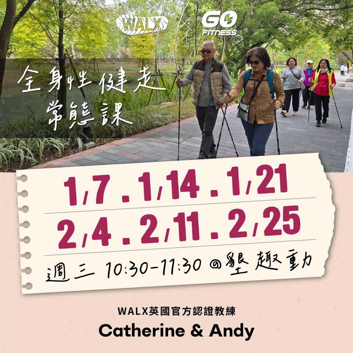 台北場 墾趣動xWALX 全身性健走常態課 黃淑鳳+高振凱教練 (1/7、1/14、1/21、2/4、2/11、2/25)